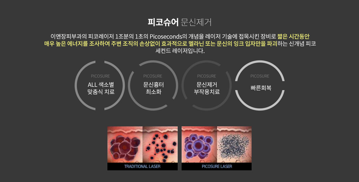 지우고 싶었던 문신! 후회까지 말끔하게 지우자! 피부손상NO / 흉터걱정 NO / 피부과전문의 이앤장피부과의 문신제거는 피부과전문의가 직점 시술합니다. 인라이튼 피코레이저의 문신제거는 750 피코펄스를 이용하여 열손상이 없고 효과가 검증된 파장으로 손상을 줄여 흉터와 부작용을 줄여 문신을 말끔하게 제거합니다.